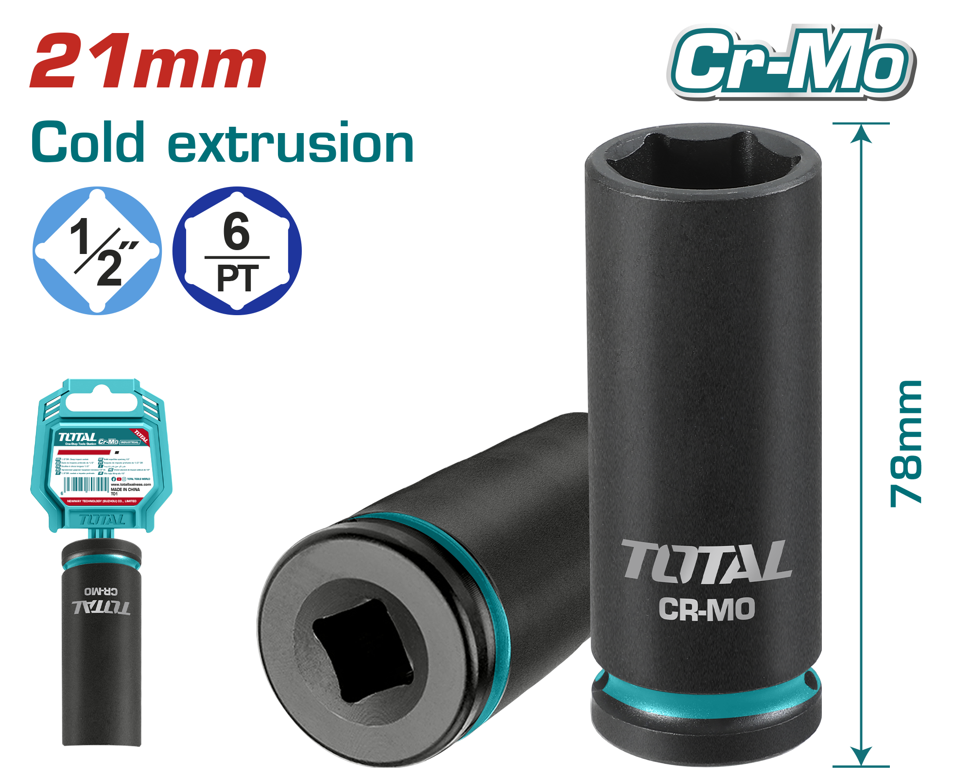 The TOTAL 1/2″ Drive 21mm Deep Impact Socket (THDIS12212L) is designed for demanding fastening and loosening applications with impact tools. Made from premium Chrome Molybdenum (Cr-Mo) steel, this socket delivers outstanding strength and durability under high torque conditions. Its deep socket design provides better reach for recessed nuts, bolts, and extended fasteners. Manufactured through cold extrusion and heat treatment processes, it ensures excellent toughness, wear resistance, and long-lasting performance in professional and industrial environments.