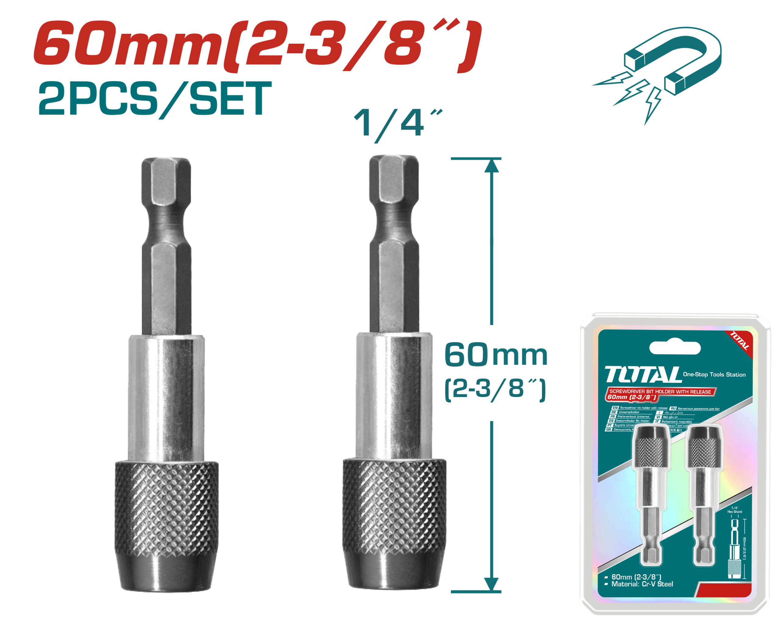 The TOTAL 60mm Screwdriver Bit Holder with Quick Release (TAC462601) is designed for efficient and secure bit holding during fastening applications. Featuring a convenient quick-release mechanism, it allows fast and easy bit changes, improving productivity during work. Constructed from durable steel, Chrome Vanadium (Cr-V), and aluminum, this bit holder provides excellent strength, durability, and long-lasting performance. With its 60mm length, it offers better reach and flexibility when working in tight or hard-to-access areas. Ideal for use with drills, screwdrivers, and other power tools.