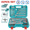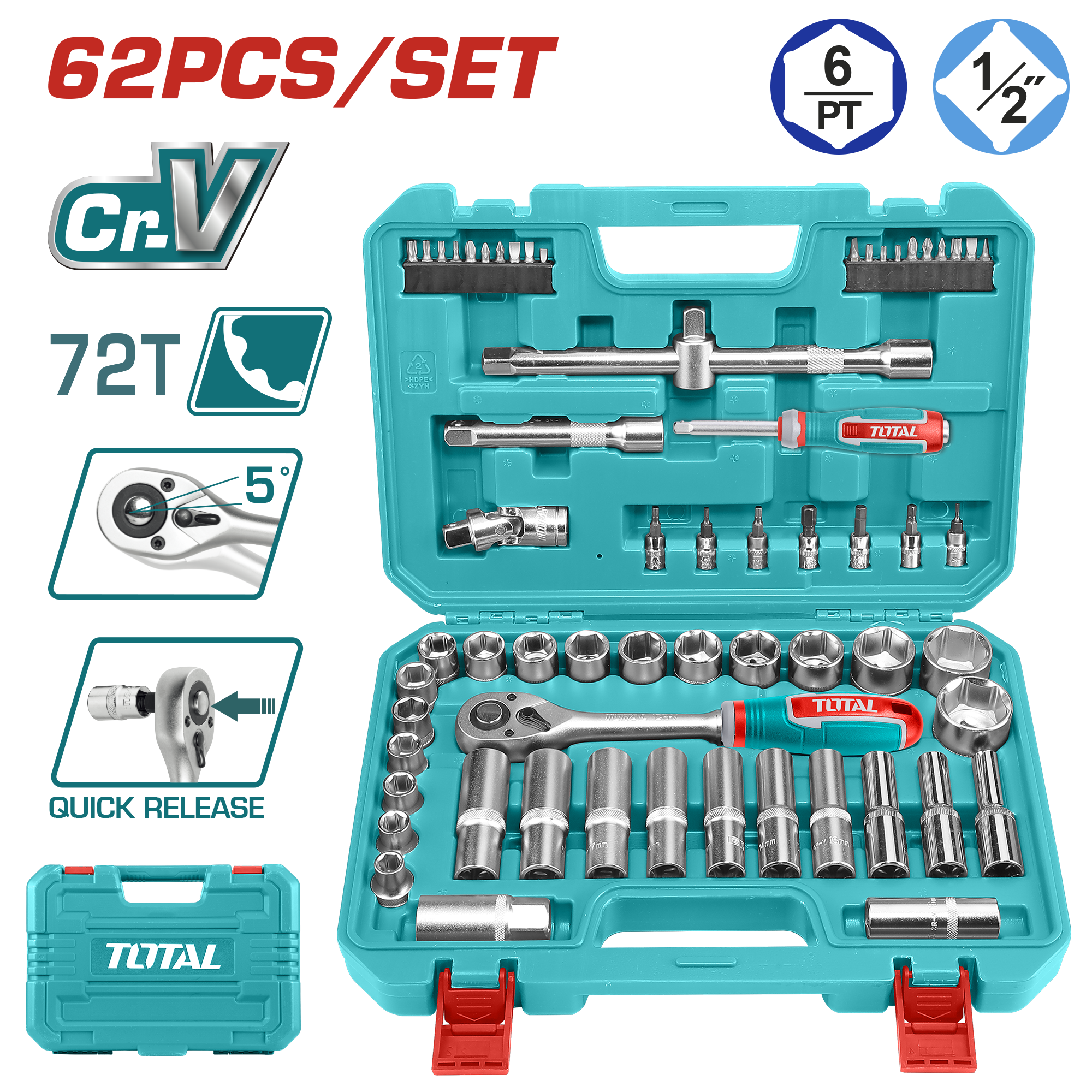 TOTAL 62PCS 1/2″ Socket Set, Cr-V Steel, 72T Ratchet, Complete Kit-THT121602