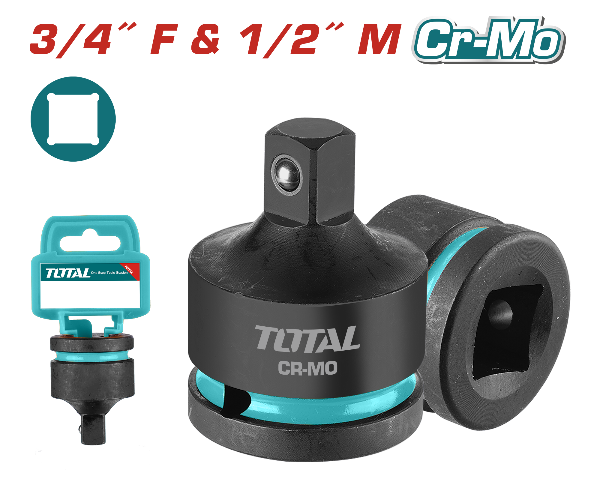 The TOTAL Impact Socket Adapter THIAD3412 is designed to convert a 3/4″ female drive to a 1/2″ male drive, allowing compatibility between different impact tools and sockets. Manufactured from high-quality Chrome Molybdenum (Cr-Mo) steel, this adapter delivers excellent strength and durability for heavy-duty applications. Built using cold extrusion and heat treatment processes, it ensures long-lasting performance and reliability in professional automotive, mechanical, and industrial environments.