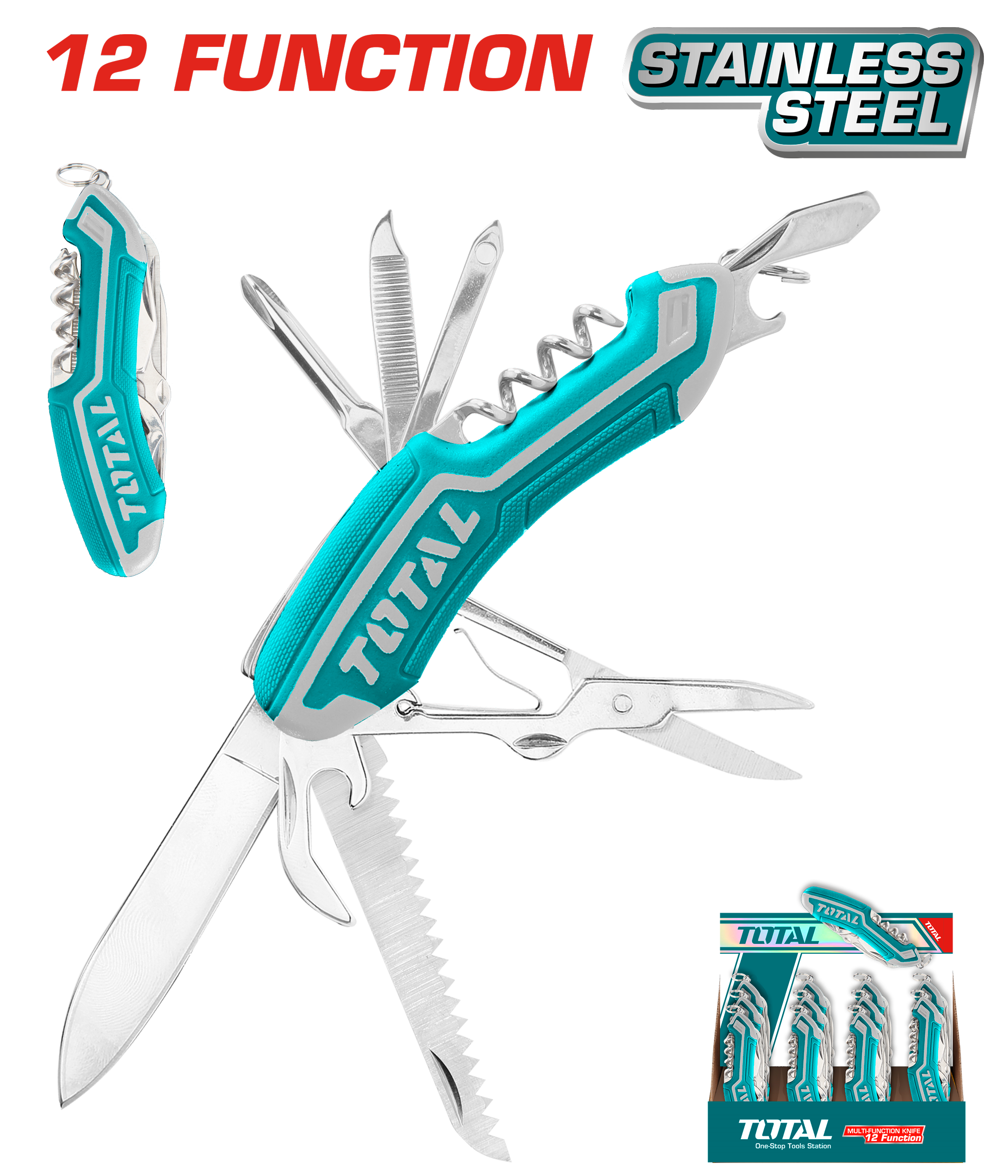 The TOTAL Multi-Function Knife (THMFK0126) is a compact and versatile 12-in-1 tool designed for everyday use, outdoor activities, and emergency situations. With multiple built-in tools, it provides a convenient all-in-one solution for cutting, opening, repairing, and general utility tasks.