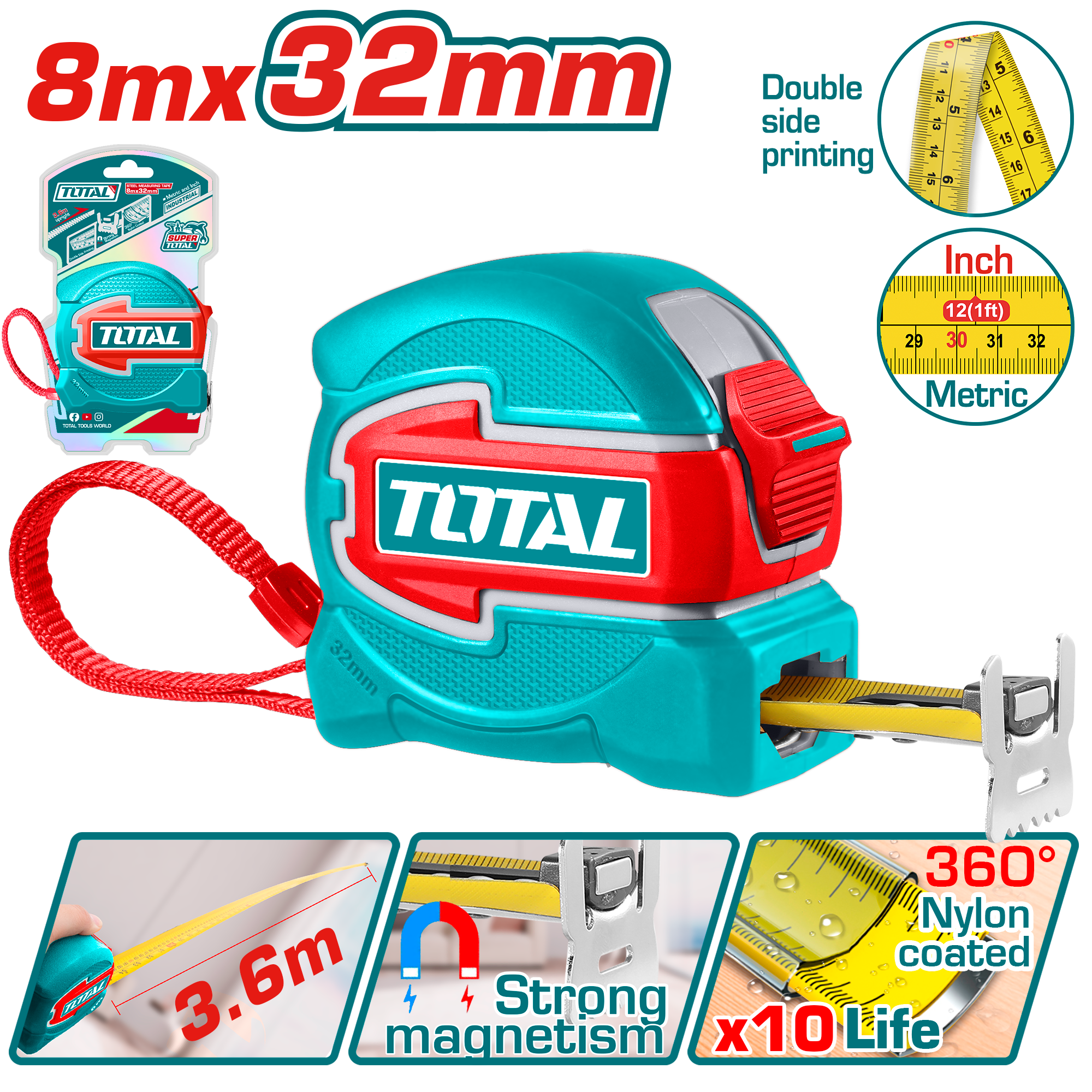 TOTAL Steel Measuring Tape 8m x 32mm, 360° Nylon Coated Blade, Magnetic Hook-TMT80832