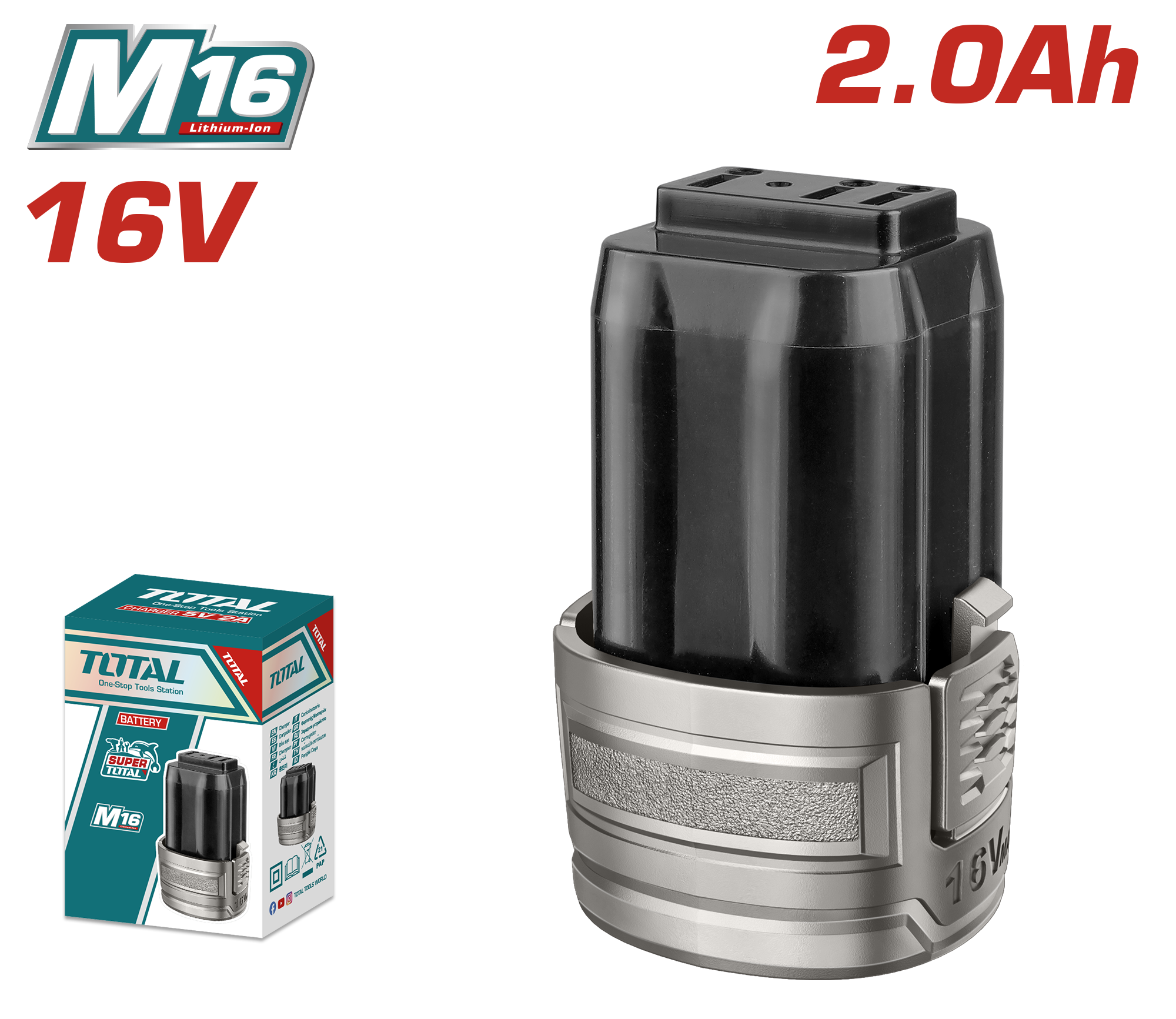 The TOTAL TFBLI1620 16V Lithium-Ion Battery Pack is designed to deliver reliable power and long-lasting performance for TOTAL M16 cordless tools. With 2.0Ah capacity, it provides efficient runtime while maintaining a compact and lightweight design for easy handling.