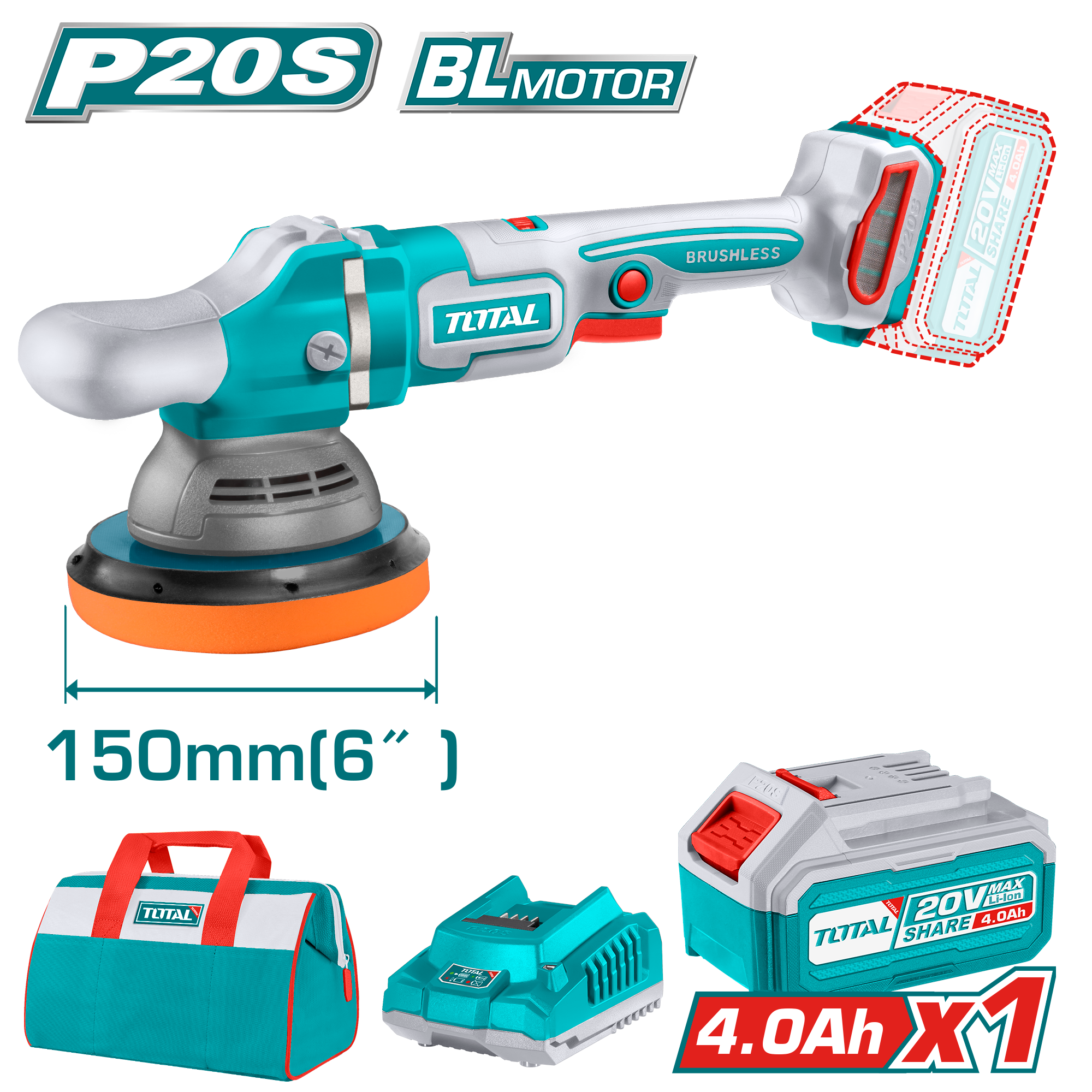Total Tools 20V Brushless Cordless Polisher – 150mm | Variable Speed | With 4.0Ah Battery & Charger | Model: TAPLI20151