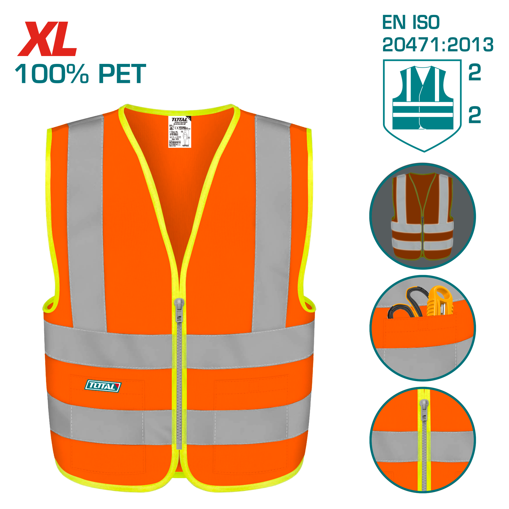 The TOTAL TSP62XL Reflective Safety Vest is designed to provide maximum visibility and safety in demanding work environments. Featuring a bright fluorescent orange color with reflective strips, this vest ensures high visibility during both day and night operations.